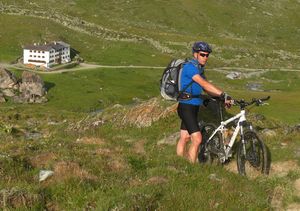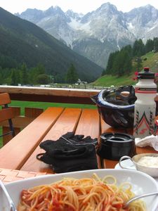 Wir überquerten um 12:30 Uhr den Inn am Sportplatz und orientierten uns am Wanderweg nach S-Charl anstatt die Teerstraße zu nehmen. Landschaftlich war der Weg durch die Clemgiaschlucht sehr reizvoll, wenngleich wir erneut viele Schiebepassagen hatten. Nie lange, aber immer wiederkehrend – modernes Bergwandern eben. Am Ausgang der Schlucht schraubten wir uns den Hang hinauf zur Teerstraße, die uns bis nach S-Charl führte. Dort angekommen stärkten wir uns mit Spaghetti als erneut unsere Allgäuer Bekanntschaft auf der Sonnenterrasse erschien und zwar vollkommen entspannt. Sie waren spät dran und hatten den Bus von Scuol nach S-Charl genommen. Mit ihnen zusammen und zwei weiteren Bikern brachen wir gegen 15.15 Uhr auf und durchfuhren das traumhafte Hochtal bis zur Alp Astras auf leicht ansteigenden Forstwegen. Schnell waren wir den anderen entkommen und fuhren nach der Alb weiter den Trail durch Krüppelkiefern in Richtung Alpenhauptkammüberquerung Pass Costainas. Hier war schön zu sehen, dass die Baumgrenze in den Zentralalpen bis auf knapp 2300 m ansteigt. Der Weg zum Pass ist komplett fahrbar ohne Schiebepassage, was uns an diesem Tage etwas wunderte. Wir erreichten auf der Abfahrt unseren Übernachtungsort Lü, ein verschlafenes 50-Einwohnerdörfchen, gegen 16:45 Uhr. Dort wurden wir erwartet, da wir bereits von S-Charl aus im Gasthof Hirschen reserviert hatten. Wir genossen dort ein Kaltgetränk auf der blühenden Terrasse, freuten uns über den Wäscheservice der netten Wirtin und fieberten auf das Abendessen hin. Dieses war vorzüglich und wir hatten zusätzlich eine nette Unterhaltung mit einem Pärchen aus der Basler Ecke während draußen ein kleiner Schauer niederging und uns den schönsten Regenbogen der Schweiz zauberte. Gegen 22 Uhr wanderten wir ins Bett und freuten uns auf den nächsten Tag, an dem wir wieder mehr Radfahren sollten.