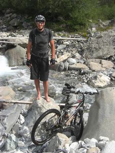 Gegen 10 Uhr erreichten wir Griosch und wähnten uns in Sicherheit, was das Schieben angeht. Dem war jedoch nicht so, da wir den falschen Abzweig nahmen und, wie im Roadbook beschrieben, zuerst einen schönen Wiesentrail fuhren. Dieser endete jedoch bei uns inmitten eines Steilhanges, der gespickt war mit umgefallenen Bäumen, groben Steinaufschüttungen und dichtem Gehölz. Wir wussten lediglich, dass wir irgendwann das steile V-Tal überqueren mussten. Und so schoben bzw. trugen wir das Fahrrad einen kleinen steinernen Flusslauf, der steil den Abhang hinunter zum Fluss führte, hinab. Das wäre alleine mit guten Wanderschuhen schon eine Meisterleistung gewesen. Aber mit 7 kg Gepäck auf dem Rücken, Bikeschuhen und diesem Fahrrad in der Hand gestaltete sich dieser Abstieg als bislang schwerster und gefährlichster Streckenabschnitt. Als wir den Fluss fast erreicht hatten, konnten wir gegenüber einen Schotterweg erkennen und atmeten erst einmal tief durch bevor uns klar wurde, dass die Überquerung des fließenden Gewässers die nächste Herausforderung darstellte. Wir entledigten uns der Schuhe und der Socken und wateten durch den angenehm kalten Wildbach. Wir orientierten uns auf der Schotterstraße über Zuort in Richtung Sent, was erneutes halbstündiges Schieben entlang eines Waldtrails bedeutete bis wir die richtige Schotterpiste erreicht hatten. Diese jagten wir hinunter bis nach Sent und von dort ins Inntal hinab zum idyllische Schweizer Örtchen Scuol.
