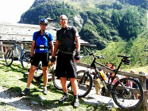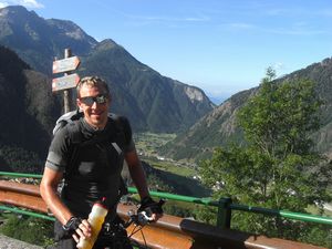 Auf der Abfahrt nach Pezzo gibt es einen unbeleuchteten Tunnel, den man aber rechts umfahren sollte. Björn hatte es aber im Geschwindigkeitsrausch vergessen und jagte mit knapp 50 Sachen in die Röhre und es war erst einmal alles schwarz – die Sonnenbrille tat ihr Übriges dazu. Doch er knipste schnell seine im Helm integrierten Blinklichter an und so konnte er diese Stelle unbeschadet meistern. Zudem war kein Verkehr im Tunnel. Die Bremsscheiben glühten als wir nach 1000 Hm Abfahrt bei Yuri in der neu eingerichteten Pension ankamen. Er ist ein typischer Italiener. Braun gebrannte Glatze, modisch gekleidet und immer ein großes Mundwerk, aber im positivem Sinne. Er stellte uns auch seinen Laptop zur Verfügung, damit wir nach Wetter und Emails schauen konnten. Im ersten Jahr betreibt er nun diese Pension und erhofft sich viel Zuspruch seitens der Mountainbiker. Unseren hat er auf alle Fälle und wir können ihn nur weiter empfehlen. Der Blick aus dem Zimmerfenster der Pension war grandios. Yuri besitzt auch eine kleine Terrasse, auf der man ebenso diese Aussicht genießen kann. Im einzigen Lokal dieses verschlafenen Bergdorfes speisten wir am Abend hervorragend und somit war auch der fünfte Tag der Tour ohne Pannen und Stürze aber mit vielen facettenreichen Eindrücken zu Ende gegangen.