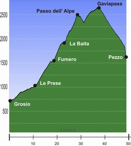 Die Weiterfahrt im Val Rezzalo auf anfangs alten Militärstrassen forderte viel Kraft. 200 Höhenmeter unterhalb des Passes ging dann nichts mehr und wir schoben diesen letzten Abschnitt auf einem schmalen Weg, der teilweise über den blanken Fels verlief. Kurz hinter dem Passo dell’ Alpe rasteten wir neben einem Gebirgsbach und so genossen wir die Ruhe und Einsamkeit, nur gestört durch einen Hubschrauber. Vorbei mit Isolation war es als wir nach kurzer Abfahrt auf der Teerstraße zum Gaviapass angekommen waren. Noch 300 Höhenmeter waren es bis zum Dach unserer Tour. Wir passierten dabei noch ein kleines Fest, auf dem Blasmusik gespielt wurde. Als wir den in der Sonne schimmernden Lago Bianco hinter uns gelassen hatten, erreichten wir um 15.15 Uhr den 2637 m hohen Gaviapass. Auf der Sonnenterrasse des dort ansässigen Lokals trällerte eine lustige Wanderschar italienische Volkslieder, was in unseren Ohren schrecklich klang.